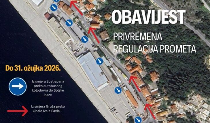 Zbog radova na izgradnji glavnog vodoopskrbnog cjevovoda Komolac – Gruž, na snazi je privremena regulacija prometa do utorka, 31. ožujka 2026.
