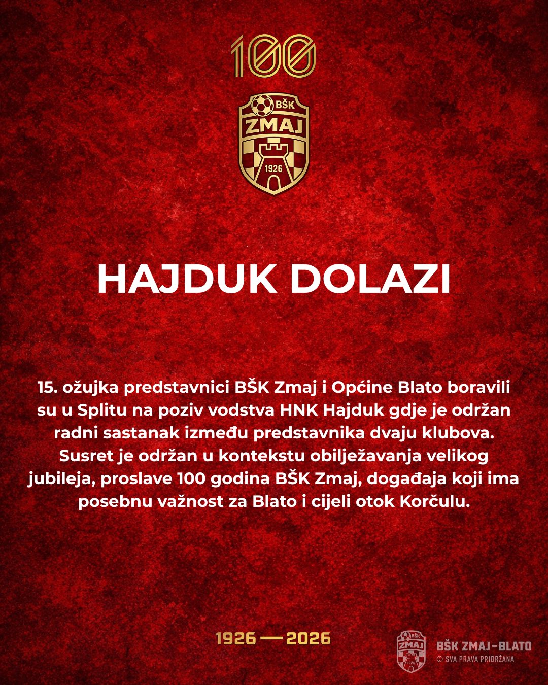 Na Poljud je Blaćane pozvalo vodstvo Hajduka, a radni sastanak bio je 15. ožujka, uoči prvoligaške utakmice s Lokomotivom koju su potom zajedno gledali iz VIP lože. To govori o važnost malog, ali ponosnog blatskog kluba koji je bogati program obilježavanja stotog rođendana simbolično prozvao „Godinom Zmaja“ budući da će do kraja 2026. realizirati čitav niz kulturnih, zabavnih, edukativnih i sportskih događanja.