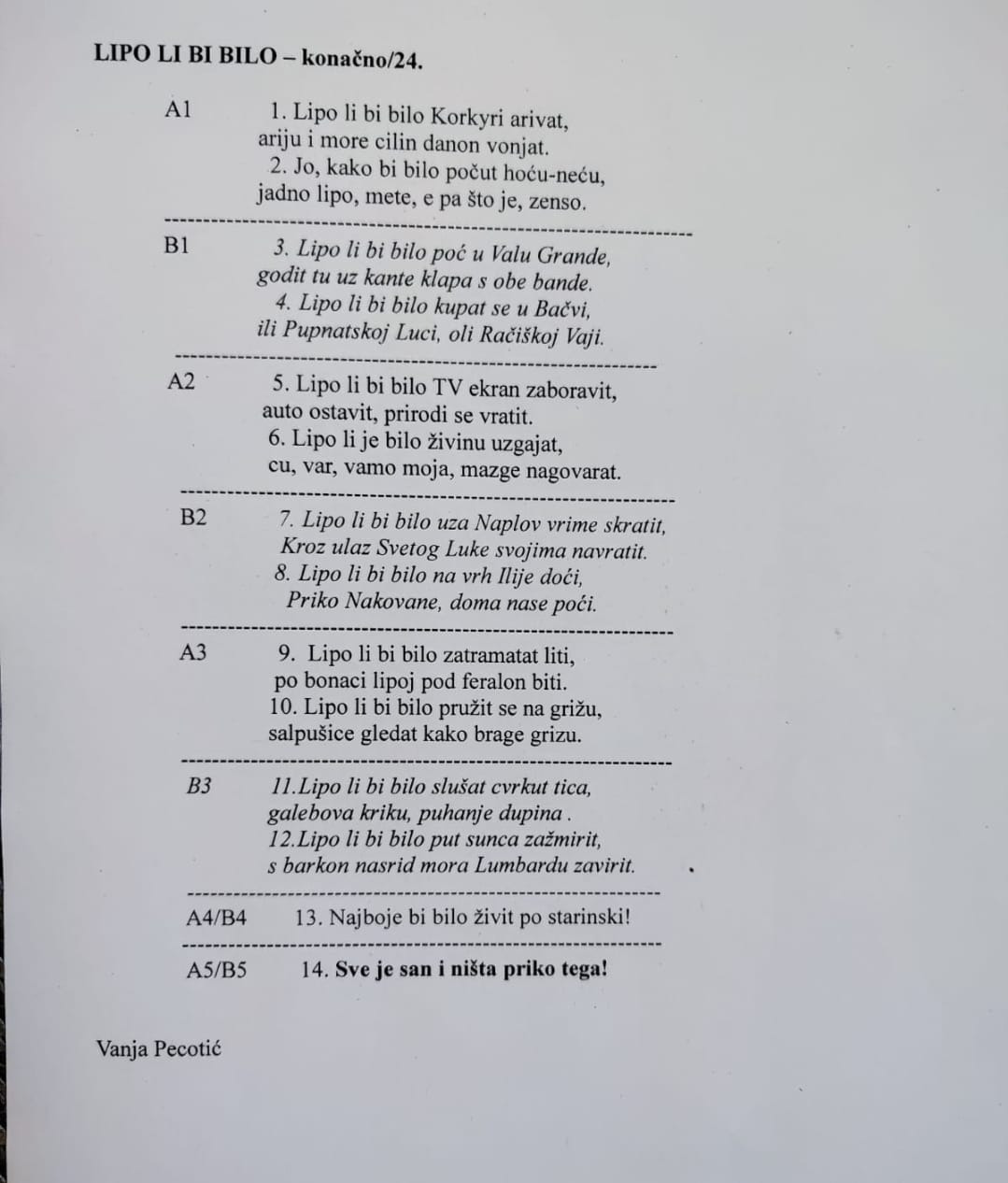 „Tijekom zime 2009. godine zapisujem svoja sjećanja na rodni otok u stihovima, dao sam im naslov ‘Lipo li bi bilo’. Stihovi su posvećeni Korčuli, oblikovani kao nostalgično nabrajanje otočnih toponima, prožeti smirujućim i arhaičnim tonom“, prisjetio se Pecotić.