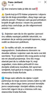 Nije trebalo dugo da gradonačelnik Korčule Frano Jeričević opozove odluku Hobera. Opoziv je objavio na svojoj službenoj FB stranici. Njegovu objavu prenosimo u cijelosti.